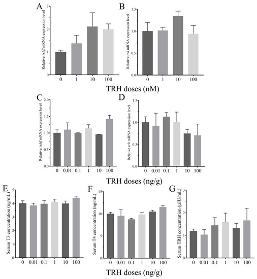 - Aoki, Y.; Takahashi, M.; Masuda, T.; Tsukamoto, T.; Iigo, M.; Yanagisawa, T. Molecular cloning of prepro-thyrotropin-releasing hormone cDNAs from the common carp Cyprinus carpio and goldfish Carassius auratus. Gen. Comp. Endocrinol. 2005, 141, 84–92. [Google Scholar] [CrossRef]