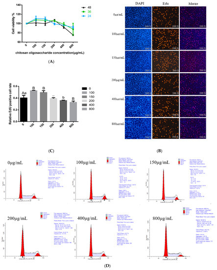 The BMECs used in the current study were isolated from a Chinese Holstein dairy cow’s mammary tissue and taken from the molecular genetics laboratory of the College of Animal Science, Jilin University [20,21]. Throughout the experiment, BMECs were cultured in an incubator at 37 °C with 5% carbon dioxide and grown in a basal DMEM/F12 medium containing 10% FBS. To determine the concentration and time for COS treatment of cells, when the cell confluence reached 70%, a total of 3 × 104 isolated BMECs were inoculated into 96-well plates (Nest Biotechnology Co., Ltd., Shanghai, China); no more than 2.5 × 105 BMECs were inoculated into the 24-well plates (Nest Biotechnology Co., Ltd., Shanghai, China), and an average of 1 × 106 cells per well were inoculated into the 6-well plates (Nest Biotechnology Co., Ltd., Shanghai, China), respectively, and cells were treated with different concentrations of COS (0, 100, 150, 200, 400 and 800 μg/mL) for the time required for each experiment to complete the detection of CCK8, Edu and cell cycle progression. To detect the effect of COS on the milk fat metabolism of BMECs and its mechanism, when the cell confluence reached 70%, we spread the cells into 6-well plates, treated and collected the cells with the selected optimal culture concentration (100, 150 μg/mL) and time (24 h) to complete the triglycerides, cholesterol, free fatty acids, real-time quantitative PCR and Western blot tests.