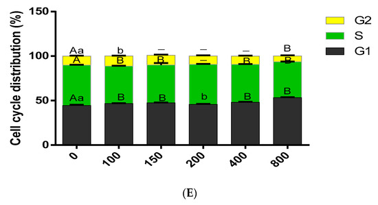 COS treatment (added to BMECs for 24 h) also affected the transformation of the BMECs cycle. The addition of COS promotes the process of the whole BMECs cycle, especially the progression of the cell cycle from S to G2. The flow cytometry assay demonstrated that as COS concentration increased, the proportion of cells in the G1 phase initially increased, whereas the proportion of cells in the S phase decreased gradually. The concentration of COS was 100 μg/mL and 150 μg/mL, increased the number of cells in the G2 phase and reached the peak. Whereas the concentration of COS was ≥ 200 μg/mL, the cell population in the G2 phase decreased with the enhance of concentration. When the concentration of COS was 800 μg/mL, the number of cells in the G2 phase reduced significantly (Figure 1D,E).