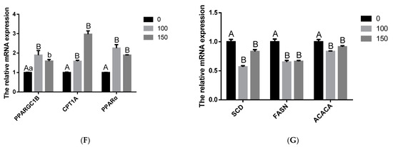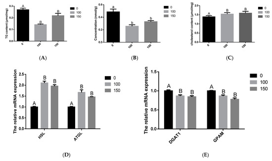 Effect of Chitosan oligosaccharide (COS) on milk fat synthesis of bovine mammary epithelial cells (BMECs). The levels of triglyceride (TG) (A), non-esterified fatty acids (NFFA) (B) and cholesterol (C) in BMECs treated with COS (0, 100, 150 μg/mL) for 24 h were measured. Further, verify that COS inhibits milk fat synthesis. The mRNA expression of HSL and patatin like phospholipase domain containing 2 (ATGL) related to triglyceride decomposition (D); the mRNA expression of genes diacylglycerol O-acyltransferase 1 (DGAT1) and glycerol-3-phosphate acyltransferase (GPAM) related to triglyceride synthesis (E); the mRNA expression of genes PPARG coactivator 1 beta (PPARGC1B), carnitine palmitoyltransferase 1A (CPT1A) and PPARα related to triglyceride decomposition (F); the mRNA expression of genes SCD1, FASN and acetyl-CoA carboxylase alpha (ACACA) related to free fatty acid synthesis (G). The data are presented as the mean ± SEM (n = 3). Different small letters showed significant difference (p < 0.05), different capital letters showed extremely significant difference (p < 0.01), and the same letters or unmarked letters had no significant difference.