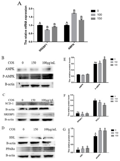 Chitosan oligosaccharide (COS) inhibits milk fat synthesis in bovine mammary epithelial cells (BMECs) via the AMP-activated protein kinase (AMPK) signaling pathway. BMECs were treated with different concentrations of COS (0, 100, 150 μg/mL) for 24 h. (A) Relative mRNA expression of SREBP1 and AMPK in BMECs treated with COS. A greyscale scan quantified the relative folds of AMPK and its downstream genes protein levels from the western blots. AMPK and p-AMPK (B); HSL and PPARα (C); SREBP1 and SCD1 (D) protein levels were detected by Western blotting. Relative protein expression levels of AMPK, p-AMPK, HSL, PPARα, SREBP1 and SCD1 compared to that of β-actin (E–G). Data were the mean ± SE from three independent experiments. Different small letters showed significant difference (p < 0.05), different capital letters showed extremely significant difference (p < 0.01), and the same letters or unmarked letters had no significant difference.