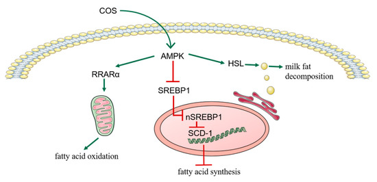 As an important energy receptor and regulator in cells, AMPK can respond to hormone or nutritional signals in peripheral tissues to regulate the energy balance of the whole body. Studies showed that COS was added to normal and LPS-treated mouse macrophages. The phosphorylation level of AMPK protein in both mice was found to be increased. Through further experiments, the raw cells treated in advance by COS were stimulated with AMPK inhibitor DD and LPS. It was found that DD eliminated the effect of COS on down-regulating the proinflammatory cytokine gene expression level and up- regulating the mRNA expression level of the antioxidant enzyme gene [14]. Previous studies have shown that AMPK can regulate the expression of SREBP-1c and PPARα, which are important genes of fatty acid synthesis. Therefore, we believe COS may regulate cellular milk fat synthesis through the AMPK pathway. COS is mainly a natural, active substance extracted from the shells of marine shrimp and crabs. It is an oligosaccharide connected by D-glucosamine through the β-1, 4-glycosidic bond. Due to the advantages of low molecular weight, high degree of deacetylation, oligomerization and complete water solubility, COS can quickly enter cells and affect energy metabolism in cells. Previous studies have shown that COS alleviates metabolic disorders such as obesity [15], dyslipidemia [16], hyperglycemia and diabetes [17]. Choi et al. [18] Found that COS can alleviate the abnormal weight gain of mice caused by a high-fat diet (HFD) and reduce the lipid accumulation in serum and liver. Kang et al. [19] found that COS can inhibit pancreatic lipase activity and combine with bile acids to reduce intestinal fat absorption and increase fecal fat excretion.
