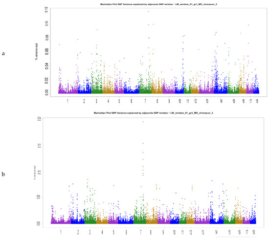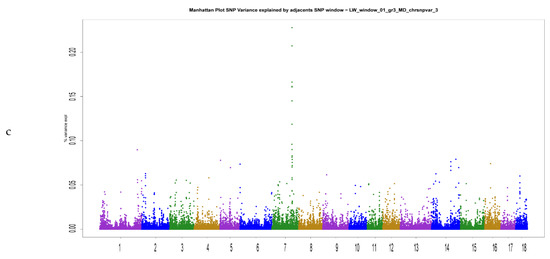 Manhattan plots of muscle depth (MD) variance explained by SNP markers based on Scenarios 1–3 (a—Scenario 1, b—Scenario 2, c—Scenario 3).