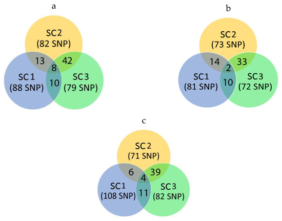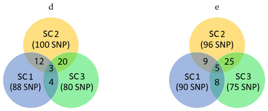 Trait/Venn diagrams showing common SNP in different groups. Values in brackets indicate the total number of SNP markers which explain 5% of a trait variability based on the respective reference group. Set intersections indicate the number of SNP markers that explain 5% of the trait variability common for calculations based on Scenarios 1–3 (SC1—Scenario 1, SC2—Scenario 2, SC—Scenario 3); a—for backfat thickness over 6–7 ribs (BF1), b—for muscle depth (MD), c—for days to 100 kg (Age), d—for number of all piglets born at the first farrowing (TNB), e—for number of piglets born alive at the first farrowing (NBA).