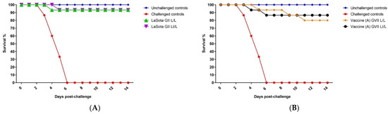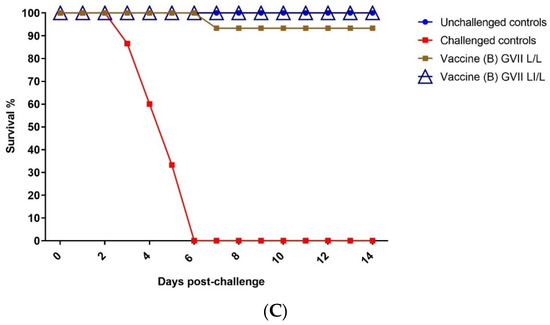 Survival of vaccinated groups post challenge with virulent genotype VII.1.1. Newcastle Disease Virus. (A) GII LaSota vaccinated group. (B) Vaccine (A) GVII vaccinated group. (C) Vaccine (B) GVII vaccinated group. Abbreviations; GII: genotype II-based vaccine, GVII: genotype VII.1.1.-based vaccine, L/L: live vaccine at 7 and 21 days, LI/L: live and inactivated at 7 days, then live vaccine at 21 days.