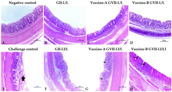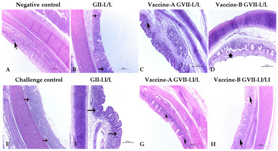 Trachea in vaccinated and control groups chicks at 7 days post challenge (H & E stain, ×100), showing the normal histopathological architecture of trachea with few lymphocytes in the submucosa and between mucosal epithelium in the negative control group (arrows) (A). The challenge control group showed severe deterioration of the tracheal structure and tracheal casts (star) (E). All vaccinated groups (B,D,G,H) had reduced tracheal mucosa damage, except for the vaccine-B GVII L/L (C) and the LaSota GII LI\L (F) groups. Abbreviations: GII: genotype II-based vaccine, GVII: genotype VII.1.1.-based vaccine, L/L: live vaccine at 7 and 21 days, LI/L: live and inactivated at 7 days, then live vaccine at 21 days.