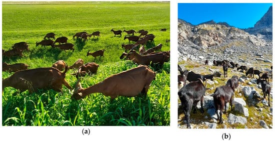 Camosciata delle Alpi (a) and Verzaschese (b) goats during free grazing (by courtesy of Mrs. Paola Rossi and Mr. Franco Del Bondio, respectively).