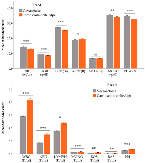 Main effect of breed on the evaluated parameters. Values are means and standard errors. *** p < 0.001, ** p < 0.01, * p < 0.05 Verzaschese vs. Camosciata delle Alpi. Ns = not significant (p < 0.05). Models also included Season and Age (as covariate). RBC = red blood cells; HGB = hemoglobin; PCV = packed cell volume; MCV = mean corpuscular volume; MCH = mean corpuscular hemoglobin; MCHC = mean corpuscular hemoglobin concentration; RDW = red cell distribution width; WBC = leucocyte count; NEU = neutrophil count; LYMPH = lymphocyte count; MONO = monocyte count; EOS = eosinophil count; BAS = basophil count; N/L = neutrophils to lymphocytes ratio.