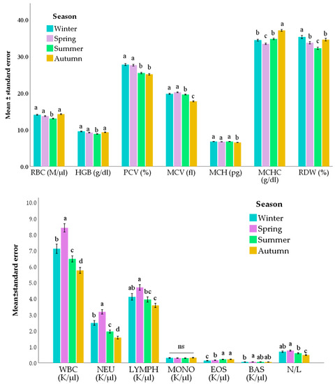 Main effect of season on the evaluated parameters. Values are means and standard errors. For each parameter, bars that do not share the same letter are significantly different (p < 0.05; multiple comparisons with Sidak correction). Models also included Breed and Age (as covariate). RBC = red blood cells; HGB = hemoglobin; PCV = packed cell volume; MCV = mean corpuscular volume; MCH = mean corpuscular hemoglobin; MCHC = mean corpuscular hemoglobin concentration; RDW = red cell distribution width; WBC = leucocyte count; NEU = neutrophil count; LYMPH = lymphocyte count; MONO = monocyte count; EOS = eosinophil count; BAS = basophil count; N/L = neutrophils to lymphocytes ratio.