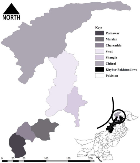 Tick specimens were collected from various herds randomly in six districts, including Peshawar (34.039825° N, 71.566832° E), Mardan (34.194697° N, 72.050557° E), Charsadda (34.161297° N, 71.753660° E), Swat (35.2227° N, 72.4258° E), Shangla (34.8883° N, 72.6003° E), and Chitral (35.7699° N, 71.7741° E) of KP, Pakistan. Ticks collected from hosts in the northern three districts, including Chitral, Shangla, and Swat, were associated with transhumant herds. The average temperature of northern districts (Chitral, Shangla, and Swat) are 0–15 °C and 15–35 °C, while the southern districts (Peshawar, Mardan, and Charsadda) are 10–28 °C and 30–43 °C in winter and summer seasons, respectively (climate-data.org) (accessed on 26 April 2022). Tick specimens were collected from various hosts available in accessible regions of the study area. The geographical coordinates of each collection site were obtained using a Global Positioning System (GPS) and processed in Microsoft Excel V. 2016 (Microsoft 365®), and then imported to ArcGIS V. 10.3.1 (ESRI, Redlands, CA, USA) to design the map (Figure 1).