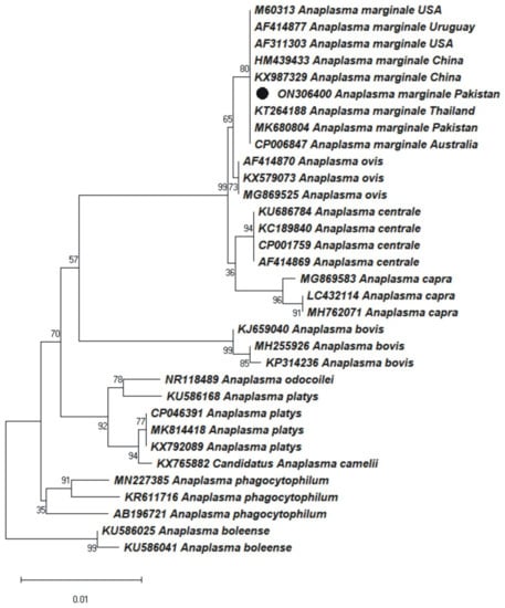 The multiple obtained identical sequences were considered as a consensus sequence. The BLAST results of the obtained 16S rDNA (1109 bp) sequences showed 98–100% identity with the A. marginale reported from Australia (CP006847 and AF414874), China (KX987330, DQ341369, FJ389579, and HM439433), Japan (FJ226454), Pakistan (MK680804, MK680806, and MK680807), Thailand (KT264188), Uganda (KU686785, KU686774, and KU686775), and the USA (AF311303, CP000030, and AF309866). Thirty-two sequences were downloaded for 16S rDNA of A. marginale from NCBI. The phylogenetic tree obtained a 16S rDNA sequence of A. marginale clustered with the identical species sequences reported from Australia, China, Thailand, Pakistan, Uruguay, and the USA (Figure 2). The 16S rDNA sequence of A. marginale was uploaded to NCBI under the accession number ON306400.