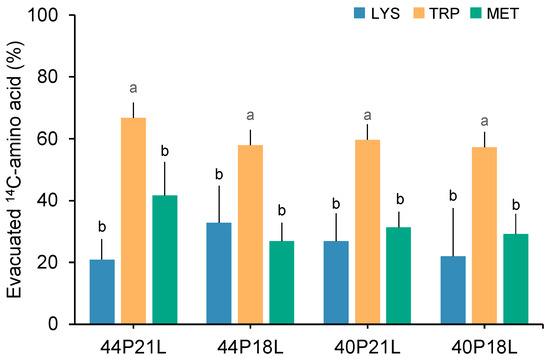 Proportion (%) of the total recovered 14C-amino acids lysine (LYS), tryptophan (TRP) and methionine (MET) that was evacuated in gilthead seabream juveniles fed 44P21L, 44P18L, 40P21L, or 40P18L diets. Values are presented as means ± standard deviation (n = 6 fish for each diet and tracer). Letters (a and b) represent significant differences among amino acids’ metabolic fate as a function of their nature (two-way ANOVA followed by Tukey’s multiple-comparison test, p < 0.05).