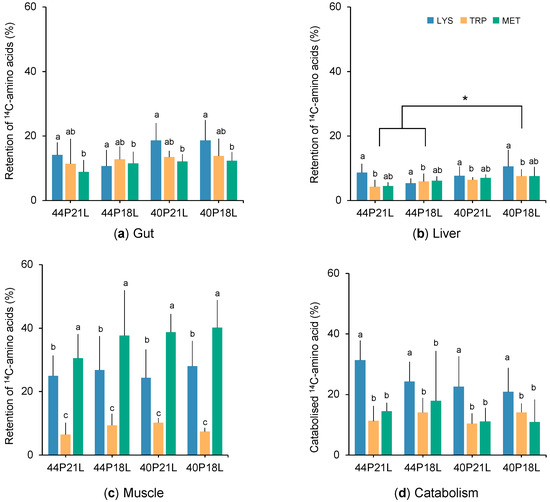 Proportion (%) of the total recovered 14C-amino acids lysine (LYS), tryptophan (TRP) and methionine (MET) that was retained in the: gut (a); liver (b); and muscle (c); or catabolised (d) in gilthead seabream juveniles fed 44P21L, 44P18L, 40P21L or 40P18L diets. Values are presented as mean ± standard deviation (n = 6 fish for each diet and tracer). Letters (a, b, c) represent significant differences among amino acids metabolic fate as a function of their nature, and * denote significant differences among dietary treatments (two-way ANOVA followed by Tukey’s multiple-comparison test, p < 0.05).