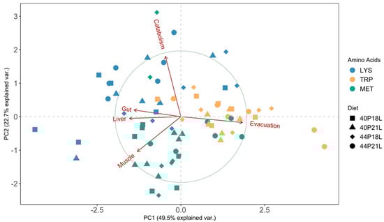 Principal component analysis (PCA) of the metabolic flux assays data generated by gilthead seabream juveniles fed different diets (44P21L, 44P18L, 40P21L, and 40P18L) labelled with 14C-amino acids lysine (LYS), tryptophan (TRP), and methionine (MET). Each point represents the projection of an individual sample in the PC1 and PC2 axis. Each dietary treatment is identified by a unique shape and each 14C-amino acid as a unique colour, as indicated in the legend.