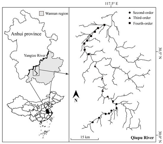 In the present study, fish were sampled in the mainstream of the Qiupu River along the headstream to its mouth. Fish sampling was conducted during December 2019 (dry season) and August 2020 (wet season), respectively. The sampling sites were distributed in second-order to fourth-order streams, with a 5–8 km interval between adjacent sampling sites (Figure 1). The sites were selected based on the principle of covering different river habitats (e.g., pools, riffles) and operability. A total of 20 stream sites were sampled, including 8 sites in second-order streams, 4 sites in third-order streams and 8 sites in fourth-order streams. Due to the high complexity of the stream habitat, we used two sampling methods to ensure the most effective catch of fish [29]. A backpack electrofishing unit (CWB–2000P, China; 12 V import, 250 V export) was used to capture fish in second-order and third-order streams with water depth less than 1.5 m. The sampling was conducted using zigzag lines to cover a 50–100 m river length within 1 h at each site. On the other hand, we used drift gill nets with a mesh size ranging from 1 to 4 cm (12 m long × 1.5 m high) to capture fish in fourth-order streams, where water depth was more than 1.5 m. At each site, two drift gill nets were set, and fish were collected after the nets were drifted with the flow for 1 h. The gill nets drifted approximately 100–200 m along the stream at each site. The fish were identified to species level, counted and released back into the stream, following standard protocols (Anhui Normal University Animal Ethics Committee).