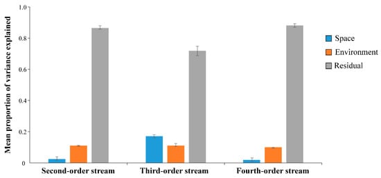 Relative contributions (i.e., mean values averages across species seasons) of abiotic environmental conditions, spatial factors and unexplained residuals underlying potential species associations to variation in fish community composition for different stream orders.