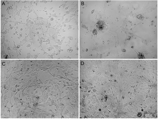 Phase-contrast micrographs of primary gonadal cell cultures on the first (A,B) and the third (C,D) passages. (A,C)—ovary-derived lines, (B,D)—testis-derived lines. Bar—100 µm.