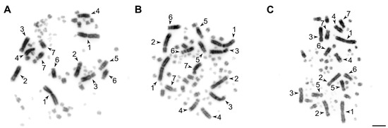The examples of metaphase chromosome plates prepared from the short-term ovary (A) and testis-derived (B) cell cultures of the great tit and testis-derived cell culture of the starfinch (C). The arrowheads indicate the seven largest macrochromosomes. Bar—5 μm.