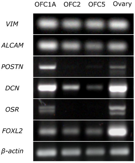 The results of RT-PCR indicate that all three cell lines expressed the fibroblast markers (VIM, ALCAM) and the marker of granulosa cells (FOXL2). The OFC1A line also expressed the markers of interstitial (stromal) cells (POSTIN, DCN) and granulosa cells (OSR) (Figure 3).