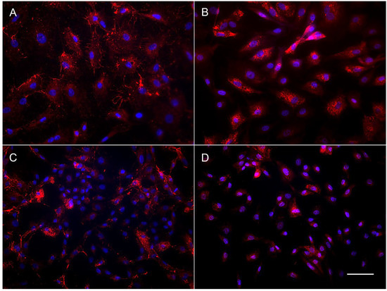 The results of immunocytochemical staining of the OFC cell cultures also revealed the difference in content between the subadult (OFC1A) and adult derived (OFC5) lines. The OFC5 line was uniformly stained by the antibodies for fibroblast-specific markers, fibronectin and collagen (Figure 4A,B). Meanwhile, the OFC1A cells varied in shape, size and morphology of the cells (Figure 4C,D), as well as in their staining pattern. In this cell culture, among the large cells brightly stained with antibodies for collagen and fibronectin, there are numerous small cells with a narrow rim of cytoplasm. This means that only some of the cells are fibroblasts.