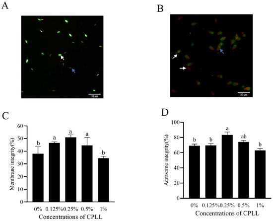 Photos of the post-thaw boar sperm stained with LIVE/DEAD sperm viability kit (A) and fluorescein isothiocyanate-peanut agglutinin (B) working solution, respectively. In image (A), the white arrow presented the post-thaw sperm with membrane integrity while the blue arrow presented post-thaw sperm with damaged integrity. In image (B), the white arrow indicated the post-thaw sperm with damaged acrosome, whereas the blue arrow indicated the post-thaw sperm with intact acrosome. Effects of supplementation with different concentrations of CPLL to the freezing medium on post-thaw boar sperm membrane integrity (C) and acrosome integrity (D). Values are specified as mean ± standard error of the mean (SEM). Columns with different lowercase letters differ significantly (p < 0.05), n = 5.