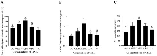 Effects of supplementation with different concentration of CPLL to the freezing medium on post-thaw boar sperm mitochondrial membrane potential (A), NADH-CoQ activity (B), and ATP level (C). Values are specified as mean ± standard error of the mean (SEM). Columns with different lowercase letters differ significantly (p < 0.05), n = 5.