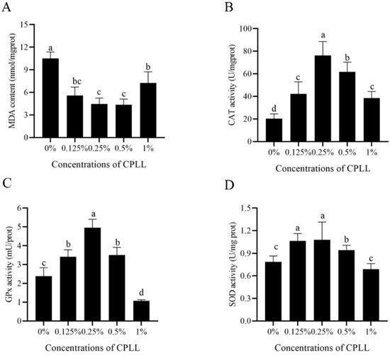 Effects of supplementation with different concentrations of CPLL to the freezing medium on post-thaw boar sperm MDA level (A), CAT activity (B), GPx activity (C), and SOD activity (D). Values are specified as mean ± standard error of the mean (SEM). Columns with different lowercase letters differ significantly (p < 0.05). CAT, catalase; GPx, glutathione peroxidase; SOD, superoxide dismutase, n = 5.