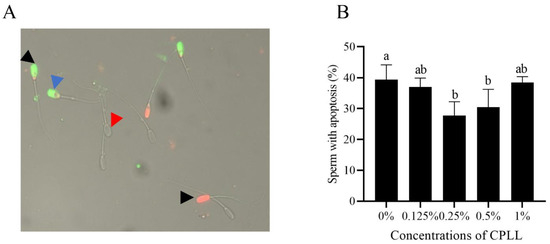 The images of post-thaw sperm stained with the Annexin V-FITC/PI assay kit (A). Blue arrow indicates the post-thaw sperm with apoptosis stained with AN+/PI− that presented green fluorescence, black arrow indicated the dead sperm stained with AN+/PI+ or AN−/PI+ that presented orange or red fluorescence, red arrow indicated the live sperm with no fluorescence. Effects of different concentrations of CPLL on boar post-thaw sperm apoptosis (B). Values are specified as mean ± standard error of the mean (SEM). Columns with different uppercase letters differ significantly (p < 0 05), n = 5.