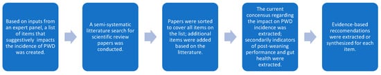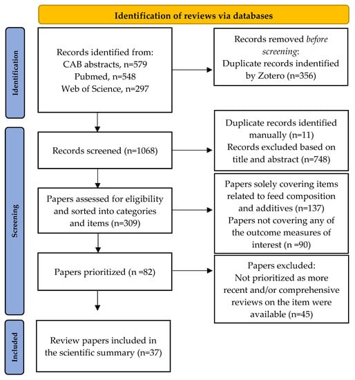Thematically, reviews of the association and causation between a given item and the occurrence of PWD was given primary priority, and secondarily, reviews of other health- and/or performance-related outcomes, such as growth performance or feed intake, as well as measures of gut health, e.g., enteric histological, immunological and microbiological measures, were included.