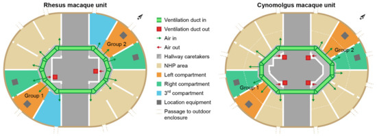In the RMU, the exhausts (40 × 80 cm) were located in the middle of the wall opposite to the enclosures and right under the ceiling and above the floor (Figure 2 and Figure 3). The ventilation exhausts (31 × 31 cm) in the CMU were located on the left and right side of each room right under the ceiling, opposite to the cages as well. A ventilation rate of six air changes per hour was considered sufficient due to the large cubic capacity of the animal rooms and the relatively low occupancy rates. Furthermore, the outdoor enclosures were freely accessible to the animals during both day and night.