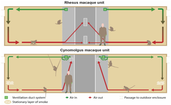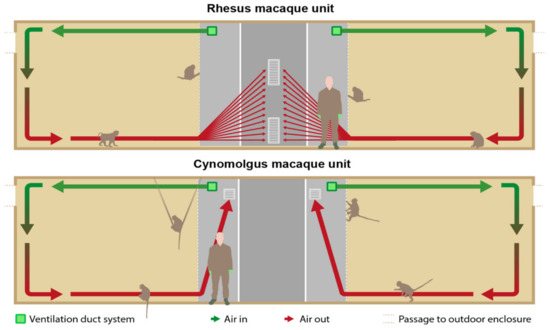 Schematic cross sectional view of the units presenting the intended airflow. In the rhesus macaque unit (RMU), the exhausts were located in the middle of the wall opposite to the cages and right under the ceiling and above the floor. In the cynomolgus macaque unit (CMU), the exhausts were located on the left and right side of each room right under the ceiling and above the floor and opposite to the cages as well.