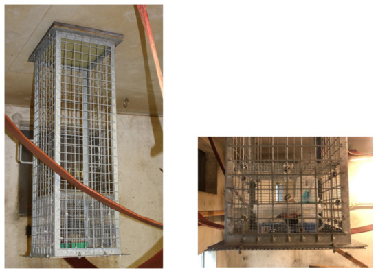 To protect the measuring equipment against the inquisitive macaques, a cage construction with a mesh wire of 5 × 5 cm, with an additional mesh wire of 1 × 1 cm around the equipment, was designed ensuring a free airflow (Figure 4). The construction measured 42.5 × 37.5 × 125.0 cm and was secured to the ceiling. The air quality was sampled approximately 1.6 m above the cage floor and 1.25 m from the ceiling in the middle of two compartments of the indoor enclosures (Figure 1).