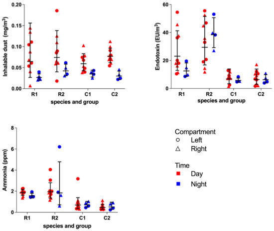 The concentrations in left and right compartments of the units together were correlated (dust rs = 0.59, p < 0.01; endotoxins rs = 0.90, p < 0.001; and ammonia rs = 0.61, p < 0.001). The GM dust concentration during daytime, in both RMU 0.069 (2.11) mg/m³ and CMU 0.068 (1.36), was significantly higher than during the nighttime, 0.033 (1.46) mg/m³ and 0.032 (1.31) mg/m³, p < 0.001, Mann–Whitney.