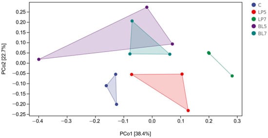 Principal coordinate analysis (PCoA) was performed for β-diversity, and the results are shown in Figure 1. The chart shows that there is a clear separation between the experimental and control groups, as well as a clear separation between the LP and BL groups. Furthermore, there was a clear split between the LP5 and LP7 groups, but no clear differentiation between the BL5 and BL7 groups.
