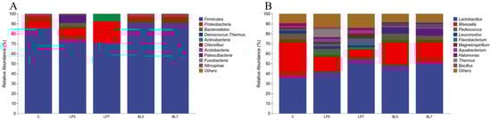 From the level of phylum (Figure 2A), Firmicutes were the dominant phylum in all treatment groups. In addition, Proteobacteria and Bacteroidetes were also found with a relative abundance higher than 1% in each group. The microbial community of different treatment groups changed greatly at the phylum level. The proportion of Firmicutes decreases with the increase of LP concentration. The proportion of Proteobacteria and Bacteroidetes increased with the increase of LP concentration. Bacteroidetes in the BL group were higher than that in the control group, the proportion of Firmicutes phylum was increased, while the proportion of Proteobacteria was decreased. The relative abundance of Firmicutes in the BL group was higher than that in the LP group, but Proteobacteria and Bacteroidetes were lower than that in the LP group.