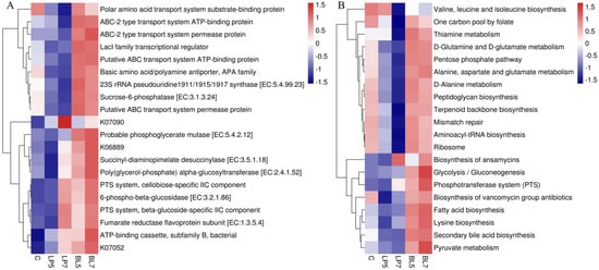 Based on the OTU tree and OTU gene information in the Greengene database, the functions of the HP silage microbiota were predicted using the PICRUSt2. The top 20 functions and pathways in abundance were chosen based on the functional annotations, action routes, and abundance information of the samples in the database, and their abundance information in each sample was drawn to the heatmap. It can be seen from Figure 3 that at the K level, the top five KEGG orthologs in relative abundance were ABC-2 type transport system ATP-binding protein, sucrose-6-phosphatase [EC:3.1.3.24], ABC-2 type transport system permease protein, LacI family transcriptional regulator, and probable phosphoglycerate mutase. The top five predicted pathways were the biosynthesis of ansamycins, secondary bile acid biosynthesis, fatty acid biosynthesis, D-glutamine and D-glutamate metabolism, and lysine biosynthesis. The heatmaps of anticipated functions and pathways (Figure 3A,B) suggested that the addition of LP and BL may have influenced the dominating functions and pathways.