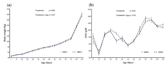 Growth performance represented as means and standard error bars of (a) BW (body weight) and (b) ADG (average daily gain) of calves fed with milk replacer content 22% CP (MR22; n = 35) or 19% CP (MR19; n = 33), according to time periods.