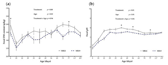 Regarding fecal DM content, there was no significant effect of the interaction treatment × age (p = 0.96; Figure 2a), although fecal DM content was affected by age (p = 0.02). The fecal DM content was not significantly different between MR22 and MR19 throughout the study, except at d 8 (MR22: 178 g/kg; MR19: 159 g/kg; p = 0.03), and d 77 (MR22: 177 g/kg; MR19: 161 g/kg; p = 0.05) of life. However, a treatment by age interaction was found for the fecal pH (p = 0.04; Figure 2b). The fecal pH did not significantly differ between both groups during entire study except at d 42 (MR22: 8.00; MR19: 7.49; p = 0.03), d 56 (MR22: 7.83; MR19: 7.48; p = 0.03), and d 77 (MR22: 7.49; MR19: 7.34; p = 0.04) of life.