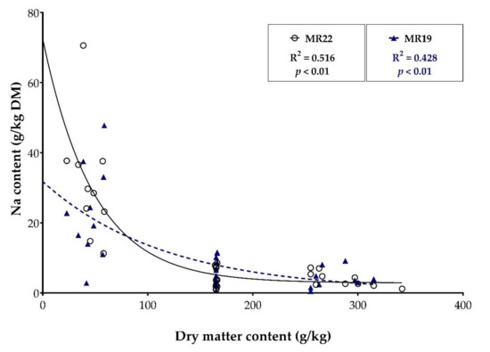 Fecal sodium levels did not differ between calves fed protein-reduced and conventional MR (MR22: 12.9 ± 15.9 g/kg DM; MR19: 11.2 ± 11.6 g/kg DM; p = 0.09). There was a moderate negative correlation between DM content and sodium content of the fecal samples in both groups (MR22: R = −0.516; p < 0.01 and MR19: R = −0.428; p < 0.01; Figure 3).