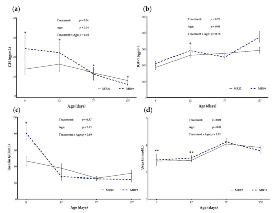 Blood metabolites represented as means and standard error bars of (a) GH, (b) IGF-1, (c) Insulin, and (d) Urea concentration of calves fed with milk replacer content 22% CP (MR22; n = 35) or 19% CP (MR19; n = 33), according to time periods. * Denotes difference with p < 0.05 or ** p < 0.01.