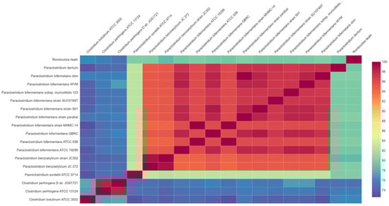 Relationship of P. bifermentans GBRC among other 17 closely related organisms. The average nucleotide identity (ANI) matrix was generated using ANI calculator and the enveomics collection toolbox genome was used for distance matrix calculation.