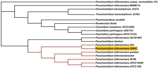 Phylogenetic tree reconstructed with the neighbor-joining method based on the whole genome sequence of the Paraclostridium bifermentans strains and related genus of Paraclostridium. P. bifermentans GBRC showing the phylogenetic relationship with the related species.