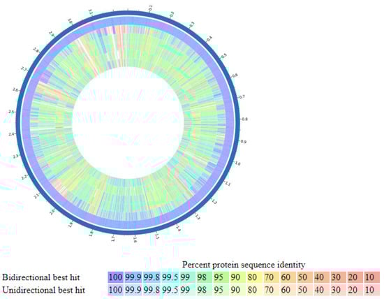 Proteome comparison: The entire proteome for each different strain is aligned against the P. bifermentans GBRC proteome. Track order from outside to inside is shown in the top right part of the figure where the reference strain, GBRC, is the most outside circle. The color key indicates the percentage of protein sequence similarity over the entire genome. The list of tracks, from outside to inside includes P. bifermentans GBRC, P. bifermentans strain Cbm, P. bifermentans strain MHMC-14, P. bifermentans strain DSM 14991, P. benzoelyticum strain JC302, and P. bifermentans subsp. muricolitidis 123.