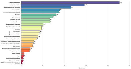 As shown in Table 4, different general characteristics for strain GBRC and their closely related species were compared. Strain GBRC differs from the other three isolates in that it lacks lysine decarboxylase. Starch, gelatine, and casein hydrolysis, the ability to produce H2S and indole all seem to be characteristics of strain GBRC. The results of biochemical characterization using BioLOg are shown in (Table 5). The isolate can hydrolyze gelatine, starch, and casein and also utilize various carbon and nitrogen sources as a substrate. Genomic profiles to metabolize these substrates were also studied to confirm its substrate utilization capability (Table 5). KEGG computerizes data knowledge on pathway databases and chemical reactions that are responsible for the various cellular processes [37]. Major biochemical pathway groups include cellular processes (124), metabolism (1560), human diseases (34), genetic information processing (149), organizational system (41), environment information processing (160), and drug resistance (26), (Figure 5). P. bifermentans is found to damage the intestinal mucosa layer and induce inflammatory response by the invasion of the tissue in the mouse [14]. Strain GBRC is found in the uterus of the buffalo; a few specific genes are present that may damage the uterus epithelial layer and cause uterine infection. For example, the internalin A gene (inlA) mainly involved in the bacterial invasion of epithelial cells further binds to the E-cadherin and MET hepatocyte growth factor receptor and invades epithelial cells [38]. In addition, pathways related to flagellar assembly, including bacterial chemotaxis (Supplementary Figure S1), two-component system, and cationic antimicrobial peptide (CAMP) resistance were found in strain GBRC. Chemotaxis has been found to have a role in biofilm development in numerous microorganisms [39,40,41] and it may guide a bacterium to swim toward nutrients (hydrophobic pollutants) adsorbed to a surface, followed by flagella attachment. Flagella have been indicated as a significant organelle responsible for bacterial adhesion, biofilm formation, and invasion into host cells [42]. In various pathogens, flagellin and/or the distally located flagellar cap protein have been reported to function as adhesins [43]. The biofilm form by pathogenic bacteria helps to sequester antimicrobial agents and makes it difficult to clear the infections. P. melaninogenica, A. pyogenes, and E. coli have all been reported to infect uterine linings in cattle, and have also been found to produce biofilm in uterine linings, suggesting that biofilm formation could be a major cause of persistent uterine infections [44,45].