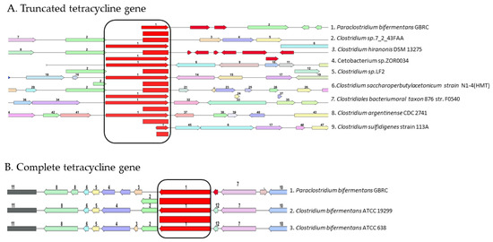 (A) Comparison of the truncated gene (1) TetM/TetW/TetO/TetS family tetracycline resistance ribosomal protection protein with different genera; (B) comparison of full gene (red colored) (1) TetM/TetW/TetO/TetS tetracycline family resistance ribosomal protection protein with different bacteria.