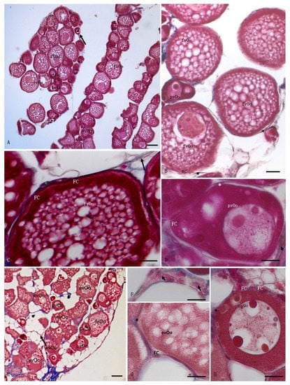 Light micrographs of Anguilla anguilla ovaries. Mallory staining. (A–D) control specimens. The ovary showed numerous fully vitellogenic oocytes (fvOos) and early vitellogenic oocytes (evOos), along with few previtellogenic oocytes (pvOos) and connective interfollicular cells (arrowheads). (E–H) Exposed specimens, containing more connective tissue (arrows) and previtellogenic oocytes (pvOos) than the control specimens. FC, follicular cells; *, theca cells. Scale bars: (A,E) = 100 μm; (B) = 50 μm; (C,D,F–H) = 5 μm.