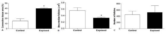 Histomorphometric analysis of Anguilla anguilla ovaries. (A) Percentage of connective tissue relative to gonad area; in the exposed eels, connective tissue occupied a larger area in the gonads than the control animals. (B) Mean area of follicles; follicles in the gonads from the exposed eels were smaller than those in the controls. (C) Number of follicles present within the gonads; no differences in the number of follicles were found between the exposed and control specimens. (*) Significantly different (p < 0.05) from control values.