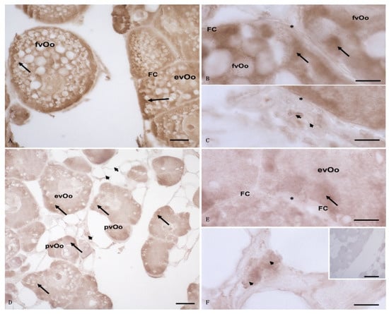 Light micrographs of Anguilla anguilla ovaries from control (A–C) and exposed (D–F) specimens. Immunolabeling with anti-3β-HSD antibody. (A–C) a wide and strong positive reaction (arrow) was visible at the level of the fully vitellogenic oocytes (fvOos) and early vitellogenic oocytes (evOos); a weak signal was evident in the follicular (FCs) and theca cells (*) as well as in the connective tissue (arrowheads). (D–F) Previtellogenic oocytes (pvOos) and early vitellogenic oocytes (evOos) were immunolabeled. In these cells, the immunohistochemical signal was in the cytoplasm as spots (arrow). A weak signal was evident in the connective cells (arrowheads). No positivity was found in the follicular (FCs) or theca (*) cells. (F) (insert) Negative control: no labeling was evident in the ovary. Bars: (A) = 20 μm; (B,C,E,F) = 5 μm, (D) = 50 μm, (F) (inset) = 100 μm.
