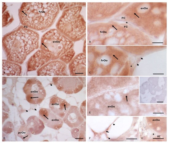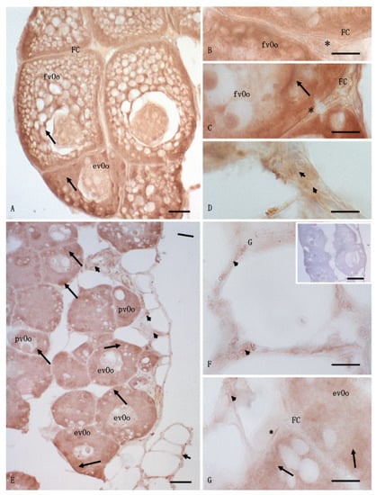 Light micrographs of Anguilla anguilla ovaries from control (A–C) and exposed specimens (D–F). Immunolabeling with anti-17β-HSD antibody. (A–C) a wide and strong positive reaction was present in fully vitellogenic oocytes (fvOos) and early vitellogenic oocytes (evOos); a weak signal was evident in the follicular (FCs) and theca (*) cells as well as in the connective cells (arrowheads). (D–G) early vitellogenic oocytes (evOos) were immunolabeled, and the signal was in some areas of the cytoplasm as spots (arrow); meanwhile, weak positivity (arrow) was localized within previtellogenic oocytes (pvOos), follicular (FC), and connective cells (arrowheads). No signal was evident in the theca cells (*). (E) (insert) negative control: no labeling was evident in the ovary. Bars: (A) = 20 μm; (B,C,E–G) = 5 μm, (D) = 50 μm, (E) (inset) = 100 μm.