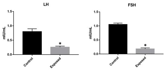 This study determined the levels of cortisol, follicle-stimulating hormone (FSH), and luteinizing hormone (LH) with an enzyme-linked immunosorbent assay (ELISA, DIAMETRA, Boldon, UK) as previously described [,]. The detection limit for cortisol sensitivity was 2.44 ng/mL, with an analytical range of 10–500 ng/mL and incubation time of 60 ± 15 min. The detection limit for FSH sensitivity was 0.17 IU/mL, with an analytical range of 5–100 IU/mL and incubation time of 60 ± 15 min. The detection limit for LH sensitivity was 0.22 IU/mL, with an analytical range of 5.0–200 IU/mL and incubation time of 60 ± 15 min.